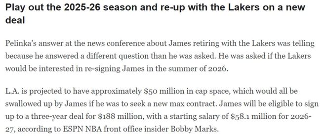 文中指出,湖人預(yù)計(jì)擁有約5000萬美元的薪資空間,但如果詹姆斯尋求一份新的頂薪合同,這筆錢將全部用于他。根據(jù)ESPN薪資專家BobbyMarks的消息,詹姆斯明年夏天有資格(和湖人)簽下一份為期三年、總額達(dá)1.88億美元的合同,2026-27賽季的起始年薪為5810萬美元(Jameswill be eligible to sign up to a three-year deal for $188 million, witha starting salary of $58.1 million for 2026-27)。